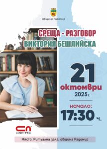 Община Радомир кани всички почитатели на съвременната българска литература на специална среща с писателката Виктория Бешлийска. Тя е по-позната на четящата аудитория с романите си „Глина“, „Сърце“ и „Нишка“. Събитието